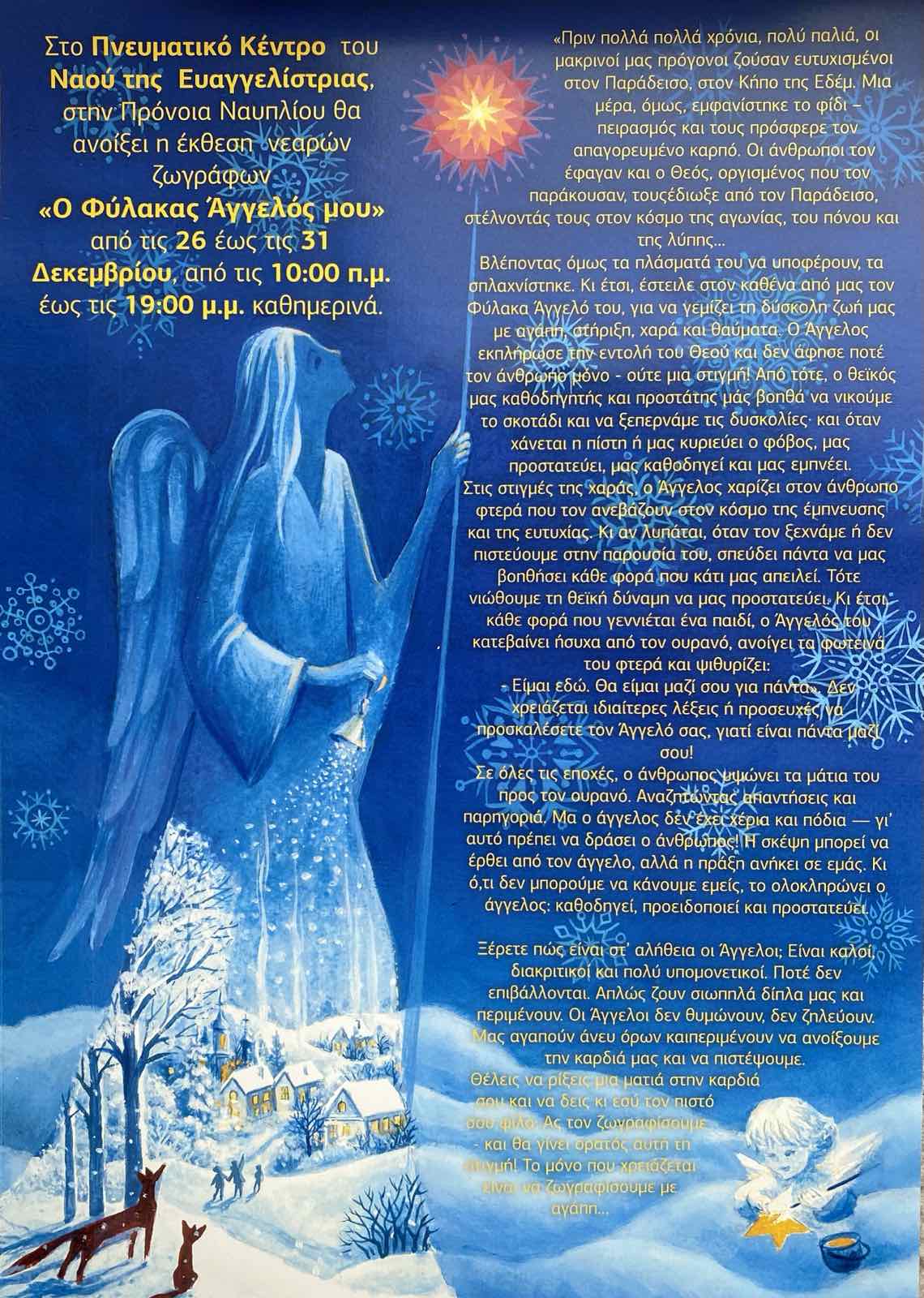 Στο Πνευματικό Κέντρο του Ιερού Ναού της Ευαγγελίστριας Ναυπλίου, θα ανοίξει μια ξεχωριστή έκθεση νεαρών ζωγράφων «Ο Φύλακας Άγγελος μου»